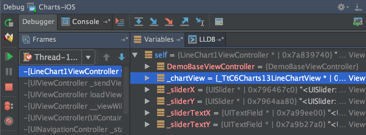Whether there was an exception, a signal or a breakpoint was met, the debugger stops and AppCode navigates you to the line of code where the problem or a breakpoint occurred. It also switches from Console to Debugger tab in the Debugger tool window. What do we have there?