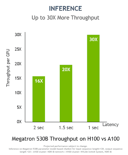 On Megatron 530B, NVIDIA H100 inference per-GPU throughput is up to 30x higher than with the NVIDIA A100 Tensor Core GPU, with a one-second response latency, showcasing it as the optimal platform for AI deployments: