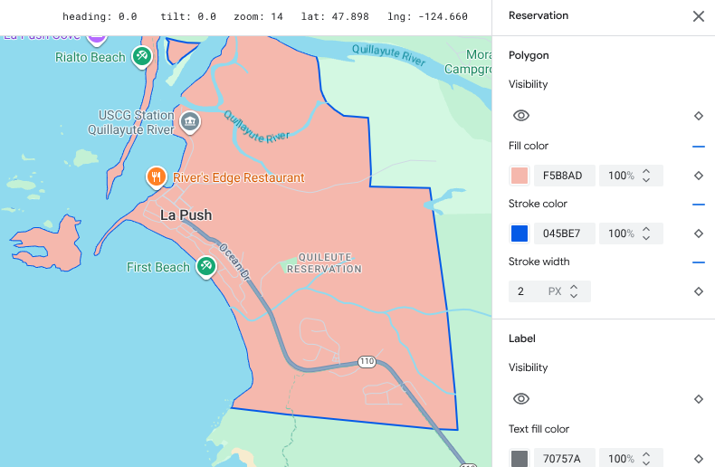 对于完全或部分以标签表示的地图项类型(例如地图注点或交通),通常可以设置以下元素的样式:“公开范围”“图标颜色”“文本填充颜色”以及“文本描边颜色”。