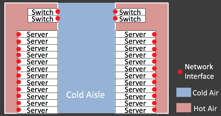 1ラックあたり90本の配線があるので、取り回しやすさは重要になります。ケーブル取り回し問題の解決のため、ToR Switchをラックの背面に設置したときにはSwitchがラック内の温かい空気を吸気してしまうので冷却に問題が出ます。(下の図)