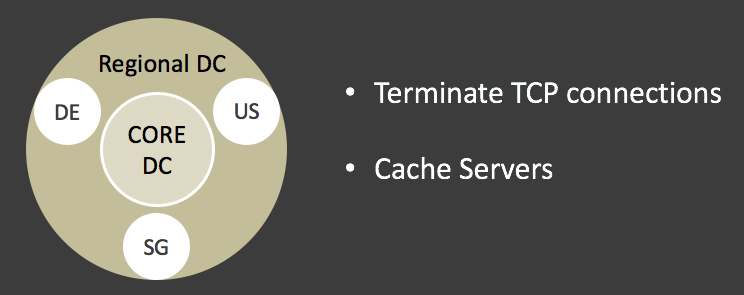 そこで従来のデータセンターをCore DCという位置づけとして考え、利用者の近くで通信を終端し、スループットの向上を目的としたRegional DCを世界の主要3拠点(アメリカ、ドイツ、シンガポール)に配置しました。