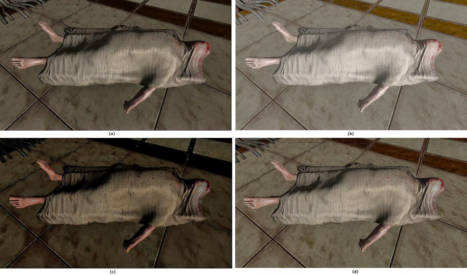 (c) Gamma decoding only, the texture is much darker and the lighting is incorrect.