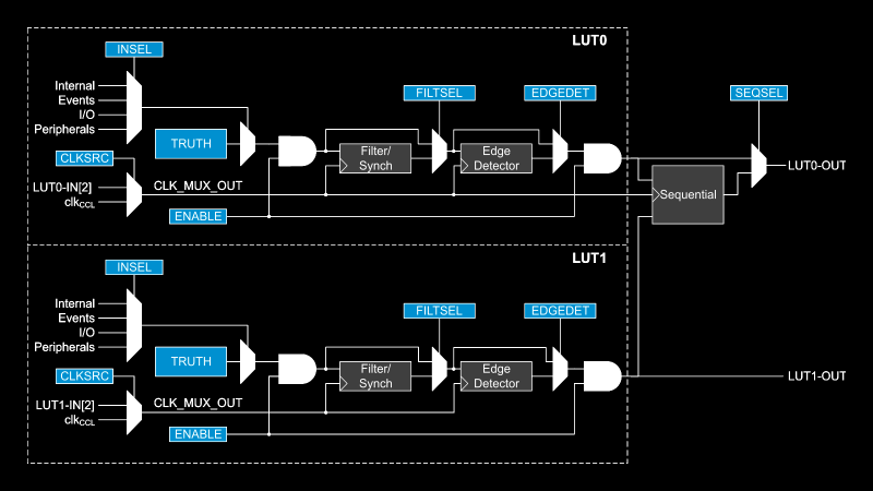 The “Getting Started with Core Independent Peripherals on AVR®” application note is a good place to get an overview of how the CIP functionality works. Configurable Custom Logic (CCL) is among one of the powerful CIP peripherals. Think of CCL as a rudimentary CPLD — a programmable logic peripheral, which can be connected to a wide range of internal and external inputs such as device pins, events, or other internal peripherals. The CCL can serve as “glue logic” between the device peripherals and external devices. The CCL peripheral offers two LookUp Tables (LUT). Each LUT consists of three inputs, a truth table, a synchronizer, a filter, and an edge detector. Each LUT can generate an output as a user programmable logic expression with three inputs and any device that have CCL peripherals will have a minimum of two LUTs available.