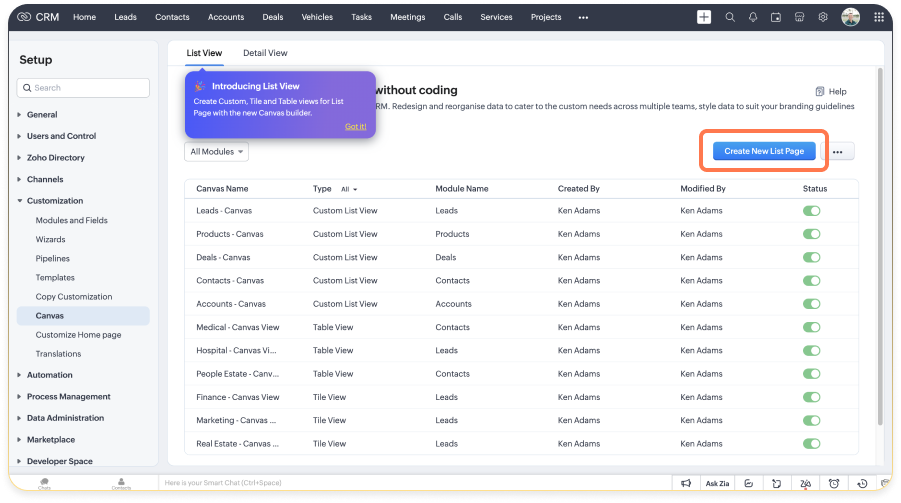 Zoho CRM offers three types of module views so you can organize data based on your requirements: list view, Kanban view, and canvas view.