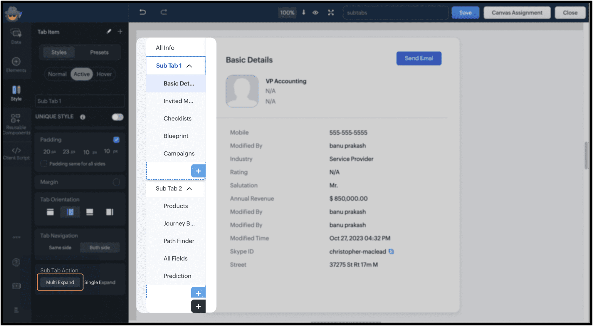 Fields from a maximum of five lookup modules can be added as part of your Canvas page. Territory, Image Upload, and File Upload fields from lookup modules cannot be added to the canvas page. However, they will be included when you add the All Fields view.Customizing the record detail page
