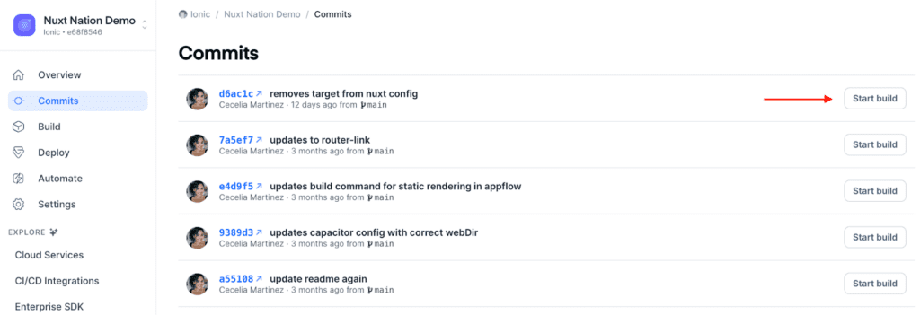 Once connected, you’ll see the most recent commit in the Commits screen in Appflow. Select ‘Start build’ from the latest commit.