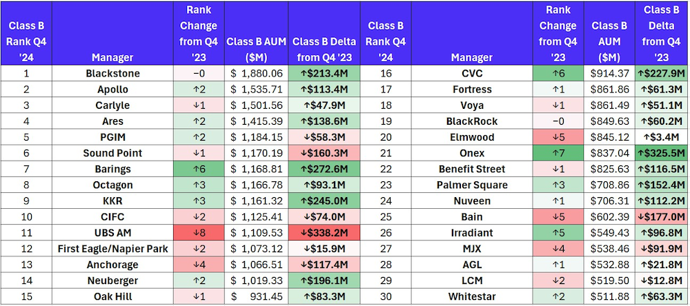 Onex Credit was another of the biggest beneficiaries of insurance capital in 2024, based on the data from New Debt Exchange, with inflows of $1.3 billion. The firm had one of the biggest increases in overall rankings, moving up 15 spots to rank 21st out of over 150 managers. The manager was also the largest recipient of investment from Janus Henderson’s market-leading CLO ETF JAAA, according to sources.