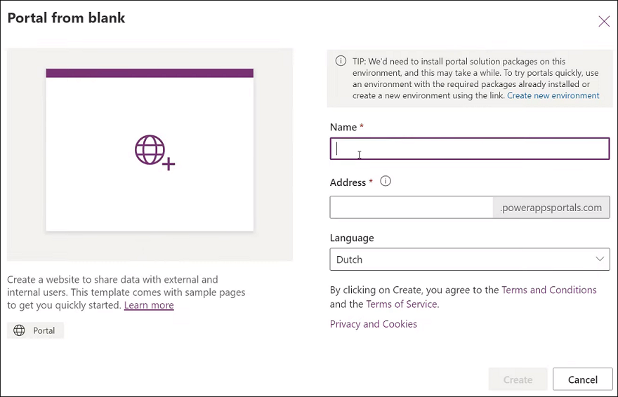 Step 1: Let's start by creating a new portal app. First, we'll give this a name and also an address. We use this to navigate to the app. Finally, we'll change the language. And, create.