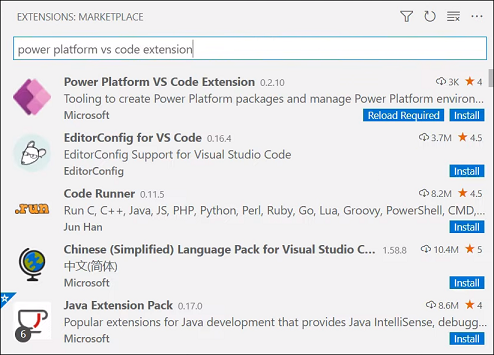 Step 3: Now we are in Visual Studio Code. We'll go to the "Extensions" menu, and in here, search for Power Platform VS Code Extension. And install it. The extension offers how to complete, the Power Platform CLI, and more. We'll use the Power Platform CLI to download and upload to the portal app.