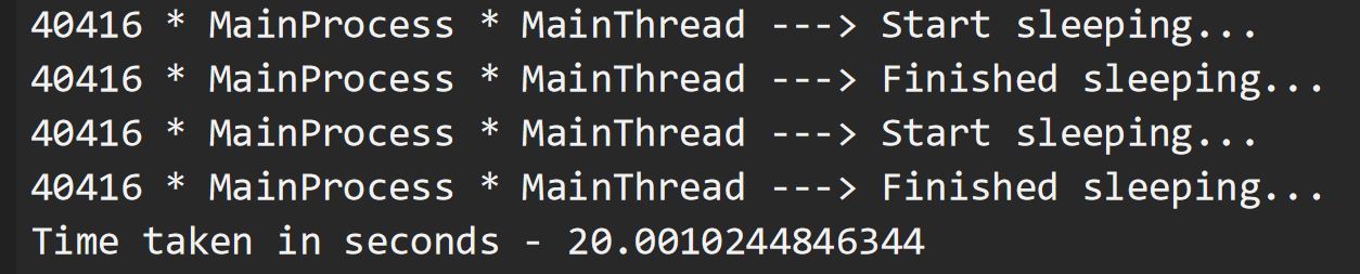 Here, we ask our CPU to execute the function io_bound(), which takes in an integer (10, here) as a parameter and asks the CPU to sleep for that many seconds. This execution takes a total of 20 seconds, as each function execution takes 10 seconds to complete. Note that, it is the same MainProcess that calls our function twice, one after the other, using its default thread, MainThread.