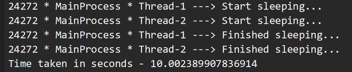Here, let’s use threading in Python to speed up the execution of the functions. The threads Thread-1 and Thread-2 are started by our MainProcess, each of which calls our function, at almost the same time. Both the threads complete their job of sleeping for 10 seconds, concurrently. This reduced the total execution time of our whole program by a significant 50%. Hence, multithreading is the go-to solution for executing tasks wherein the idle time of our CPU can be utilized to perform other tasks. Hence, saving time by making use of the wait time.