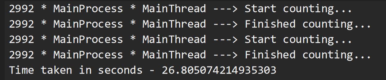 Here, we shall call our function cpu_bound(), which takes in a big number (200000000, here) as a parameter and decrements it at each step until it is zero. Our CPU is asked to do the countdown at each function call, which roughly takes around 12 seconds (this number might differ on your machine). Hence, the execution of the whole program took me about 26 seconds to complete. Note that it is once again our MainProcess calling the function twice, one after the other, in its default thread, MainThread.