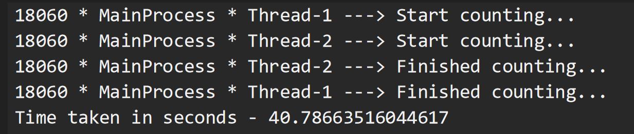 Okay, we just proved that threading worked amazingly well for multiple IO-bound tasks. Let’s use the same approach for executing our CPU-bound tasks. Well, it did kick off our threads at the same time initially, but in the end, we see that the whole program execution took about a whopping 40 seconds! What just happened? This is because when Thread-1 started, it acquired the Global Interpreter Lock (GIL) which prevented Thread-2 to make use of the CPU. Hence, Thread-2 had to wait for Thread-1 to finish its task and release the lock so that it can acquire the lock and perform its task. This acquisition and release of the lock added overhead to the total execution time. Therefore, we can safely say that threading is not an ideal solution for tasks that requires CPU to work on something.