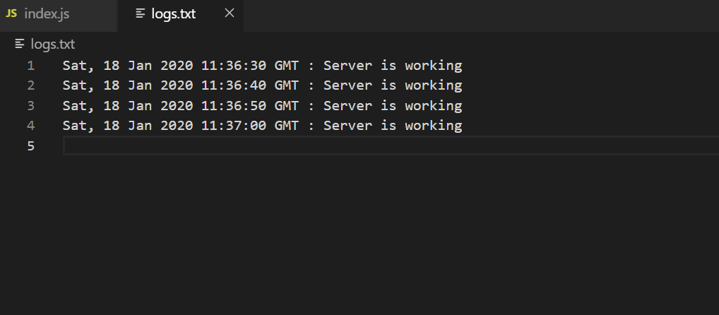 Example: This example sets up a cron job using node-cron to log a status message to logs.txt every 10 seconds.
