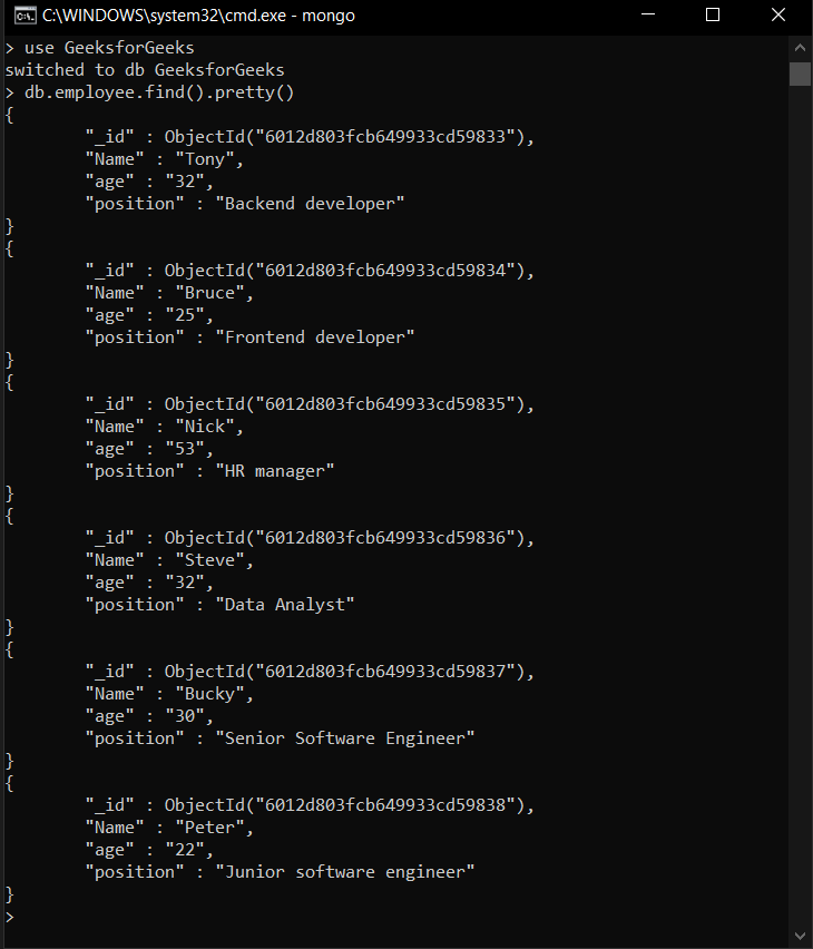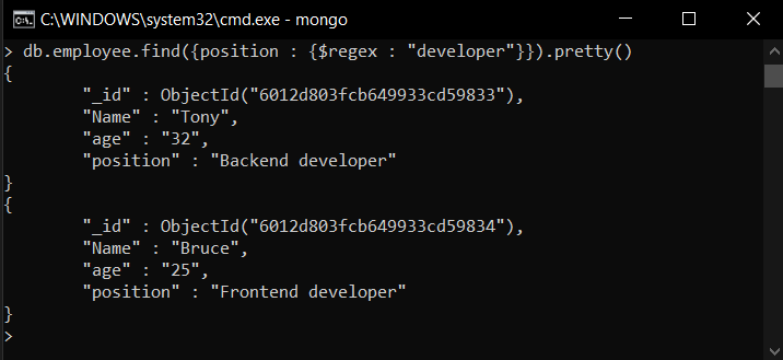 db.employee.find({position : {$regex : "developer"}}).pretty()Output:
