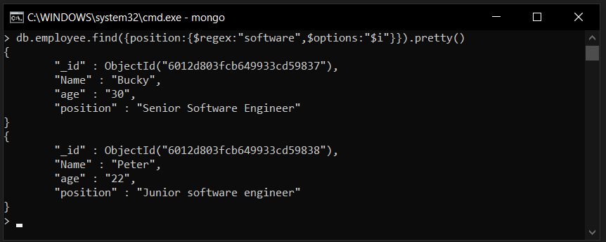 db.employee.find({position:{$regex:"software",$options:"i"}}).pretty()Output: