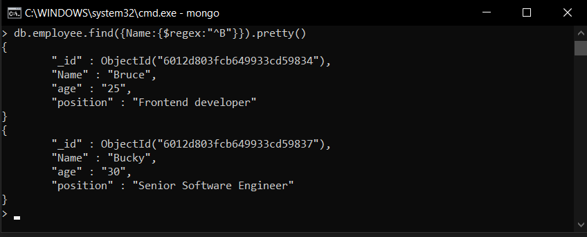 db.employee.find({Name:{$regex:"^B"}}).pretty()Output: