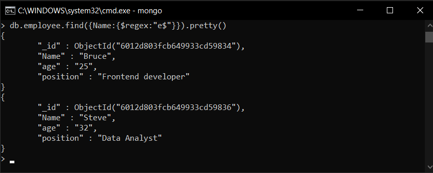 db.employee.find({Name:{$regex:"e$"}}).pretty()Output: