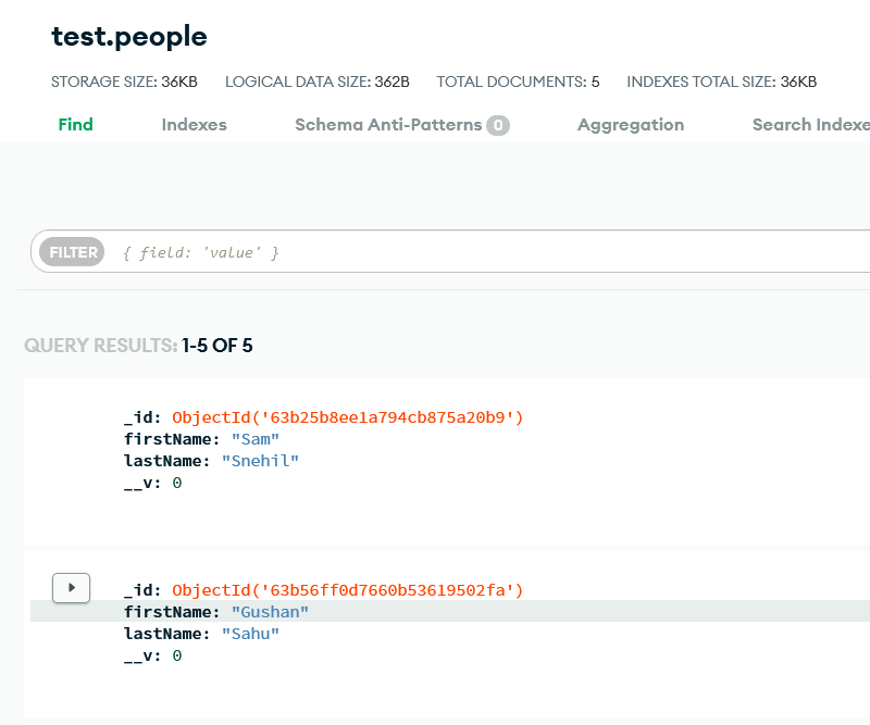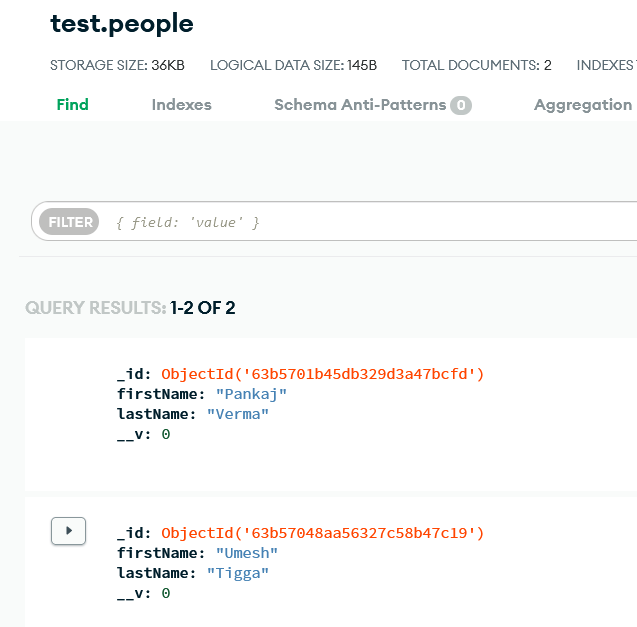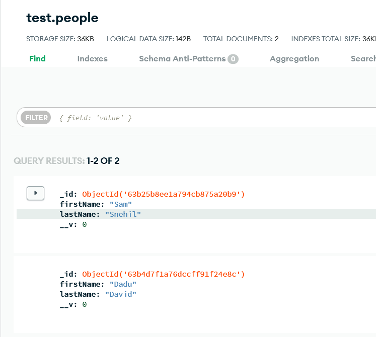 Our project is now ready, but we must first establish the database before we can work on it. We are building a database with MongoDB Cloud. The “people” collection, which we are using to create the “test” database, contains two documents. This is how the database will seem when it has been created: