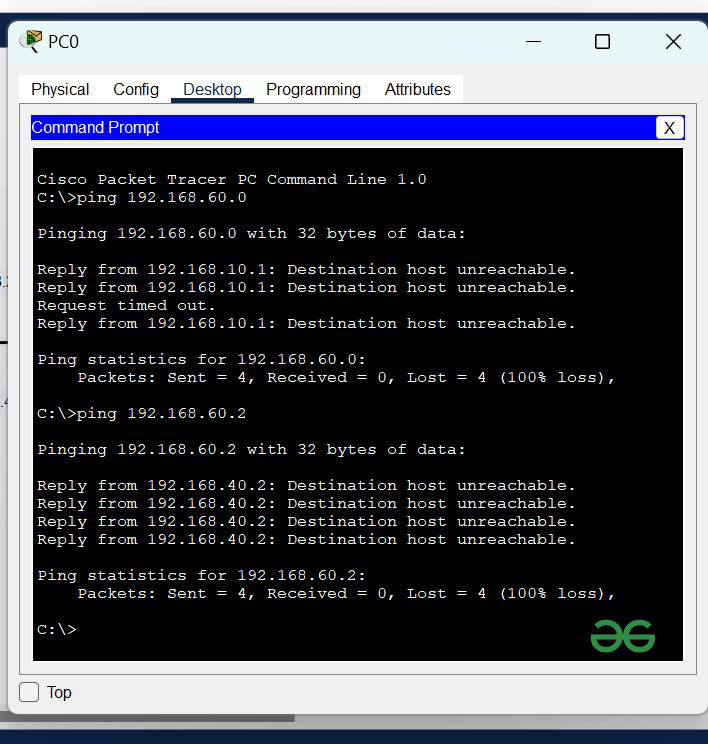In this Topology, we have a starting point which is PC0 with network id 192.168.10.0, and a destination which is PC1 with network id 192.168.60.0.