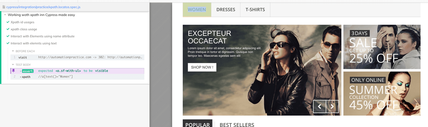 /// <reference types="cypress" /> /// <reference types="cypress-xpath" /> describe('Working with xpath in Cypress made easy', ()=>{ beforeEach(()=>{ cy.visit('http://automationpractice.com') }) it('Xpath id usages', ()=>{ cy.xpath('//*[@id="search_query_top"]') .type('Dress') .type('{enter}') .get('#center_column') .should('be.visible') }) it('xpath class usage',()=>{ cy.xpath('//*[@class="item"]//a') .eq(0) //0th element in the array of elements .click() cy.xpath('//*[contains(@class,"center_column")]') .should('be.visible') }) it('Interact with Elements using name attribute',()=>{ cy.xpath('//input[@name="email"]') .type('xyz@yopmail.com{enter}') .get(".alert") .should('contain.text','Newsletter') }) it.only('Interact with elements using text', ()=>{ cy.xpath('//a[text()="Women"]') .should('be.visible') }) }) |
