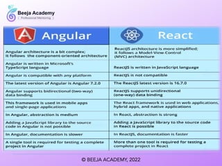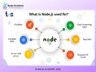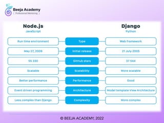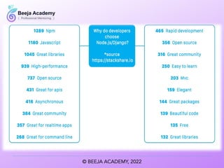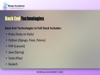 The document outlines various technology stacks used in full stack development, including the WAMP, MEAN, Django, LEMP, and Ruby on Rails stacks. Each stack consists of specific programming languages and technologies tailored for web development. These examples highlight the versatility and framework choices available for developers.